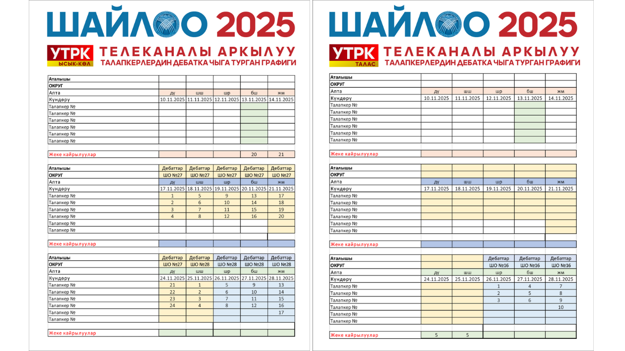 - Шайлоо округу №29 (+Маданият каналы): 21.11.25, 24.11.25, 25.11.25.