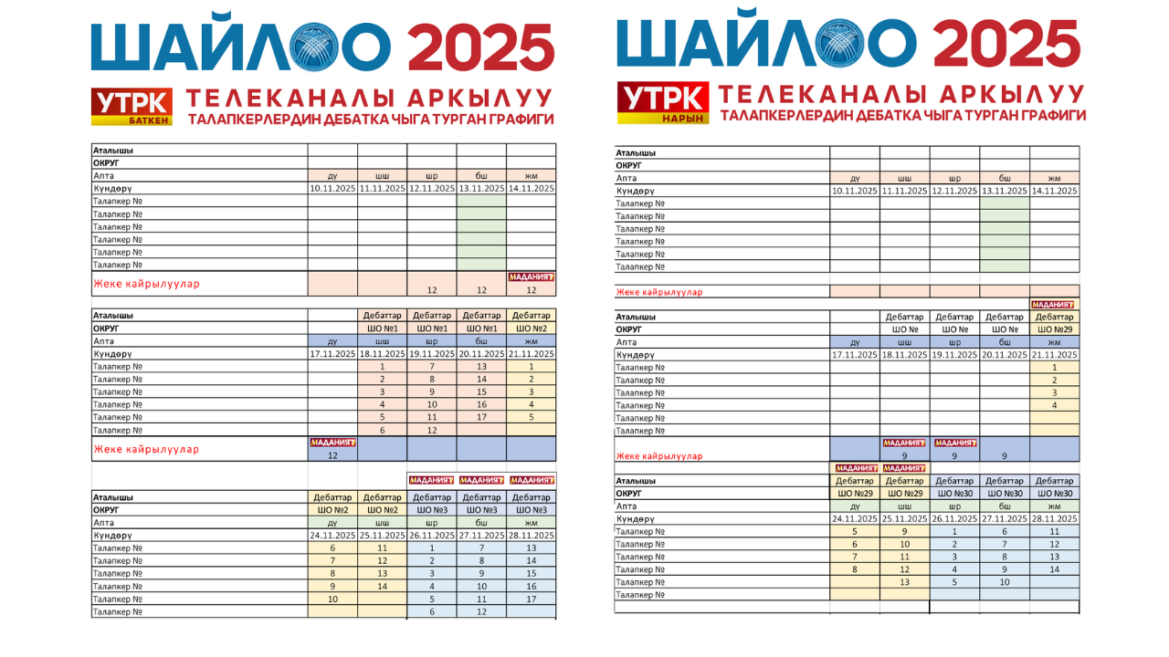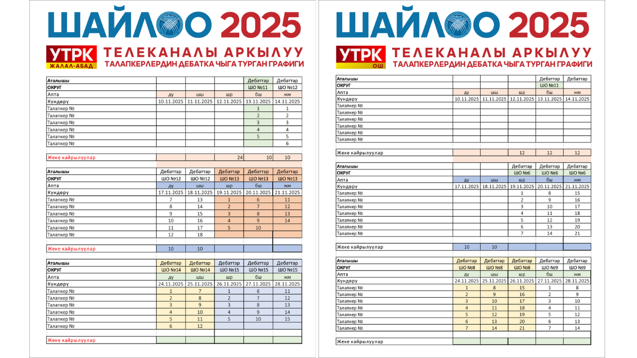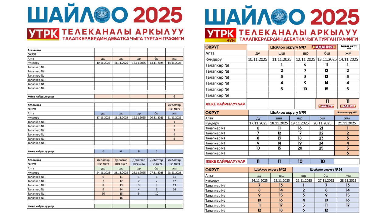 - Шайлоо округу №17 (+ Маданият каналы): 11.11.25, 12.11.25, 13.11.25.