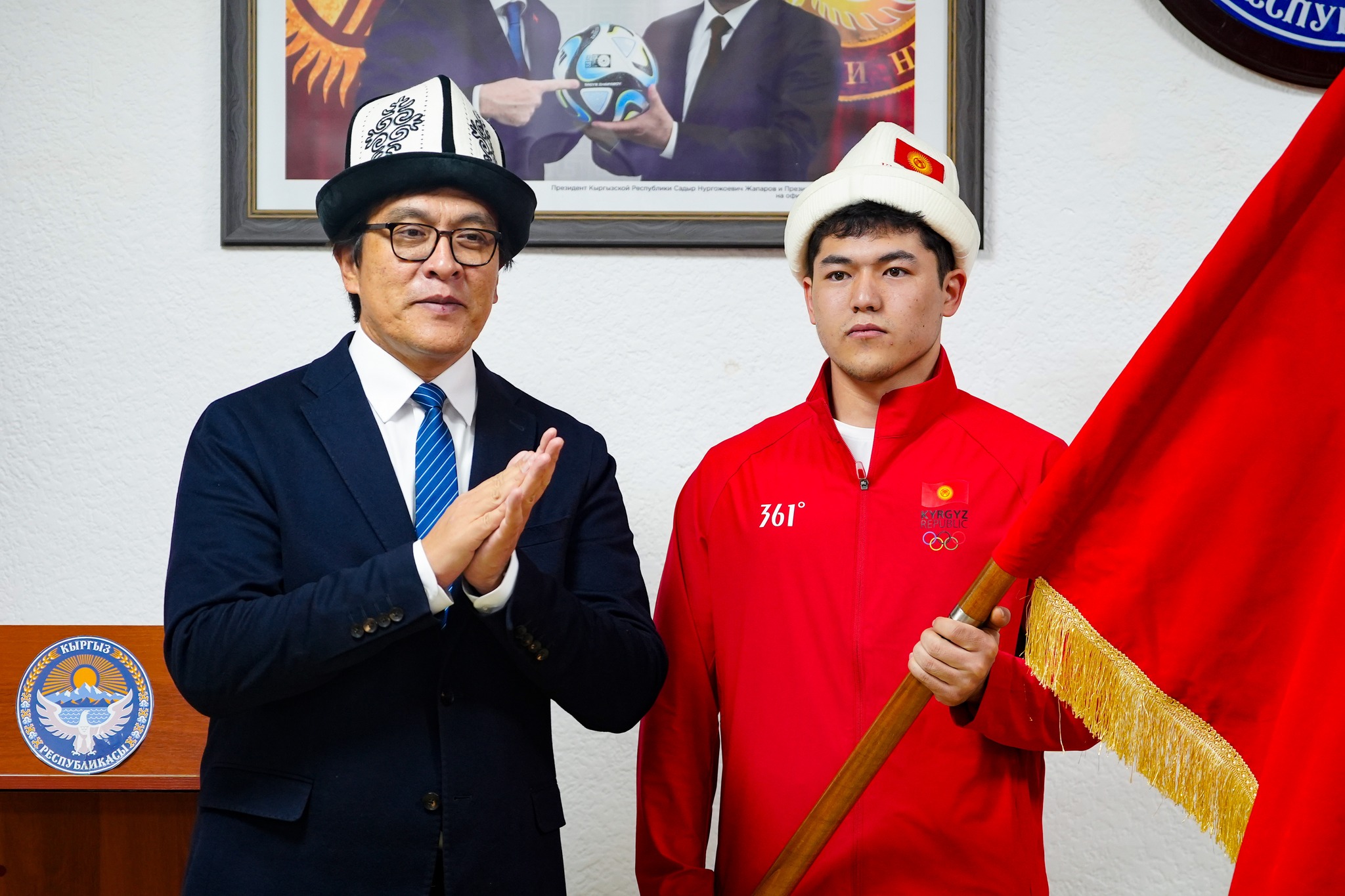 Иш-чаранын жүрүшүндө улуттук курама команданын капитаны, пара пауэрлифтинг боюнча спортсмен Азизбек Нарбаевге Кыргыз Республикасынын мамлекеттик туусу тапшырылды.