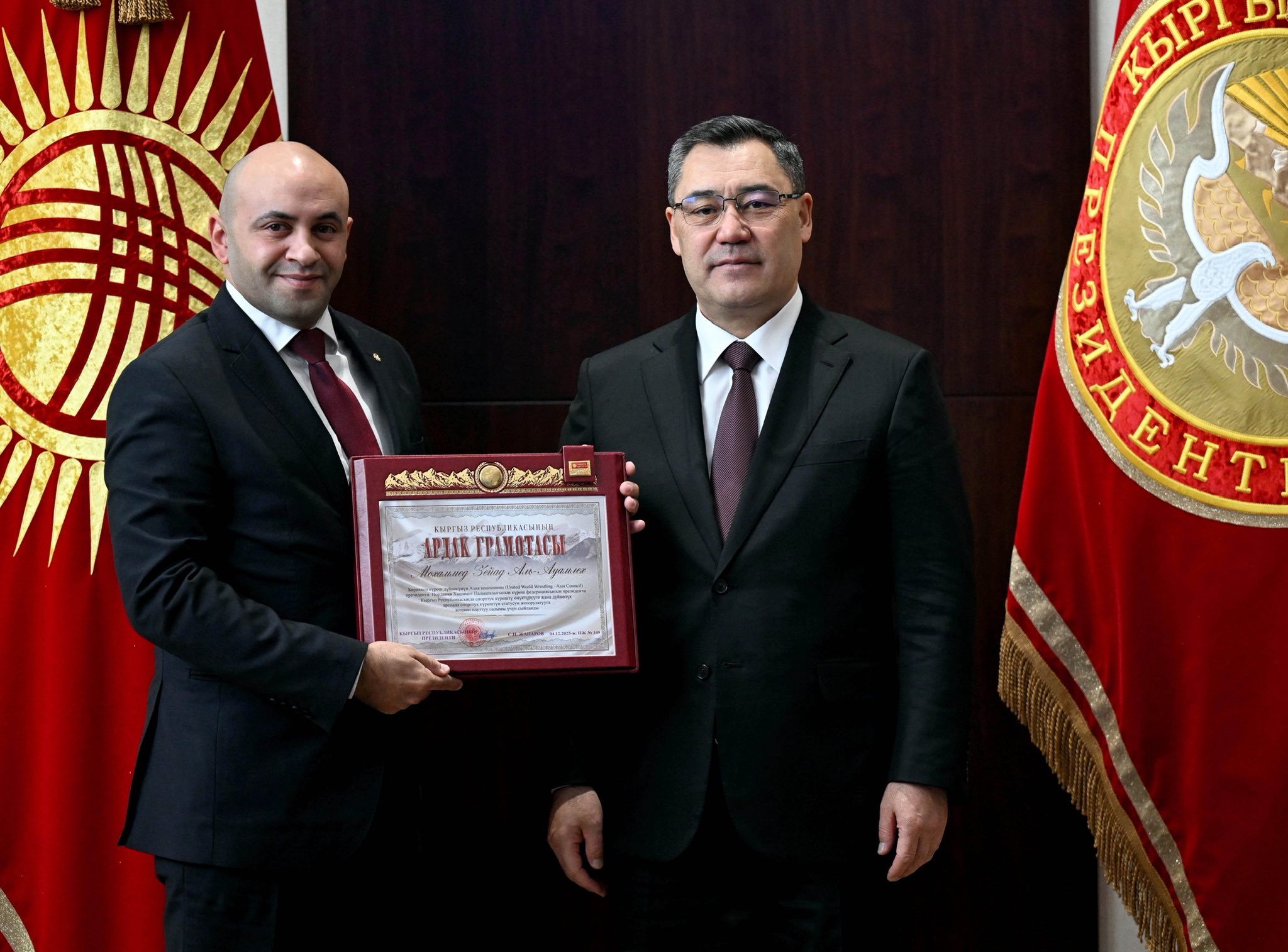 Кыргыз Республикасынын Президенти Садыр Жапаров бүгүн, 6-декабрда, Бириккен күрөш дүйнөсүнүн (United World Wrestling) президенти Ненад Лаловичти жана Азиянын бириккен күрөш дүйнөсүнүн (United World Wrestling Asia) президенти Мохаммед Аль-Авамлехти кабыл алды.