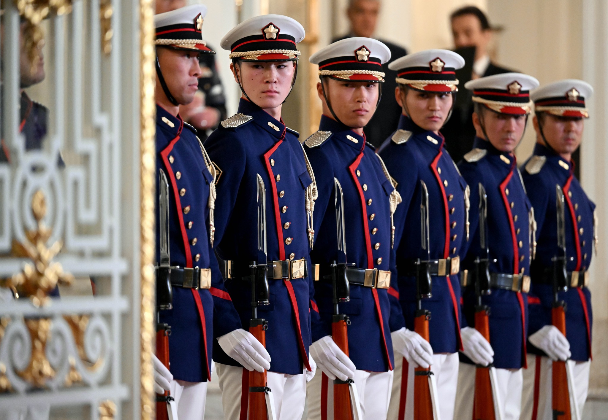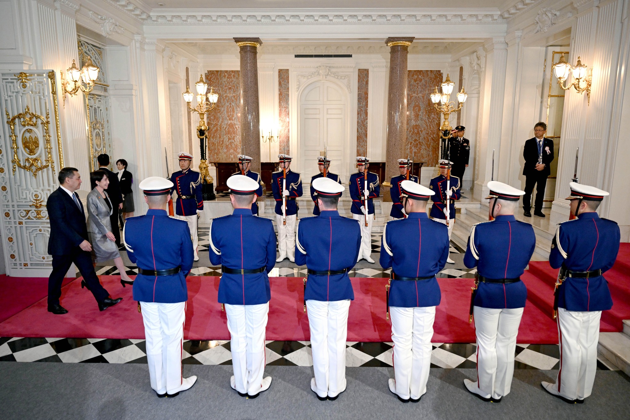 Андан соң Президент Садыр Жапаров менен Япониянын Премьер-министри Санаэ Такаити ардактуу кароол ротасынын жанынан кызыл килем үстүнөн өтүшүп, биргелешип сүрөткө түшкөндөн кийин Борбор Азия өлкөлөрүнүн лидерлеринин урматына уюштурулган тосуп алуу кечки тамагына катышуу үчүн залга өтүштү.