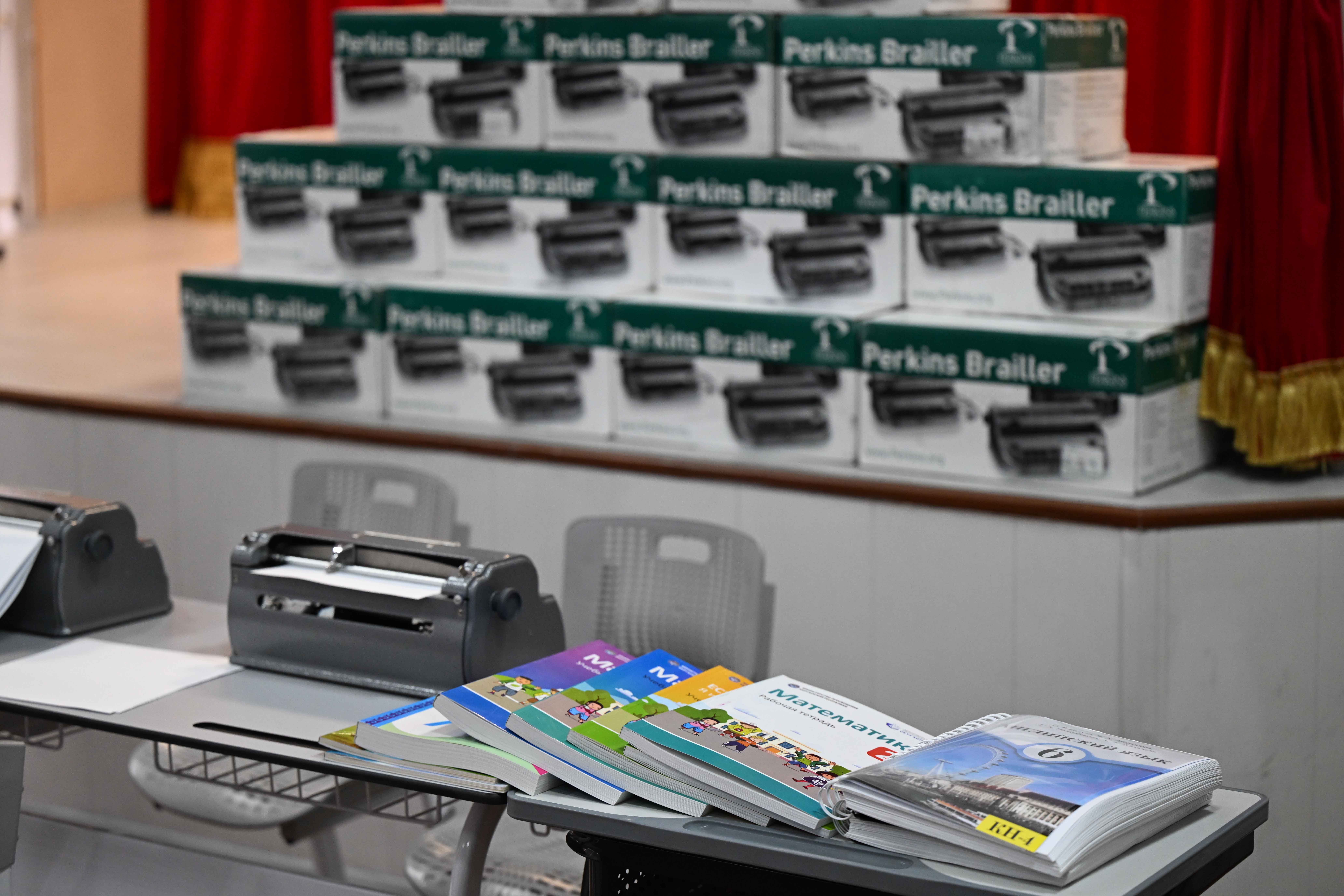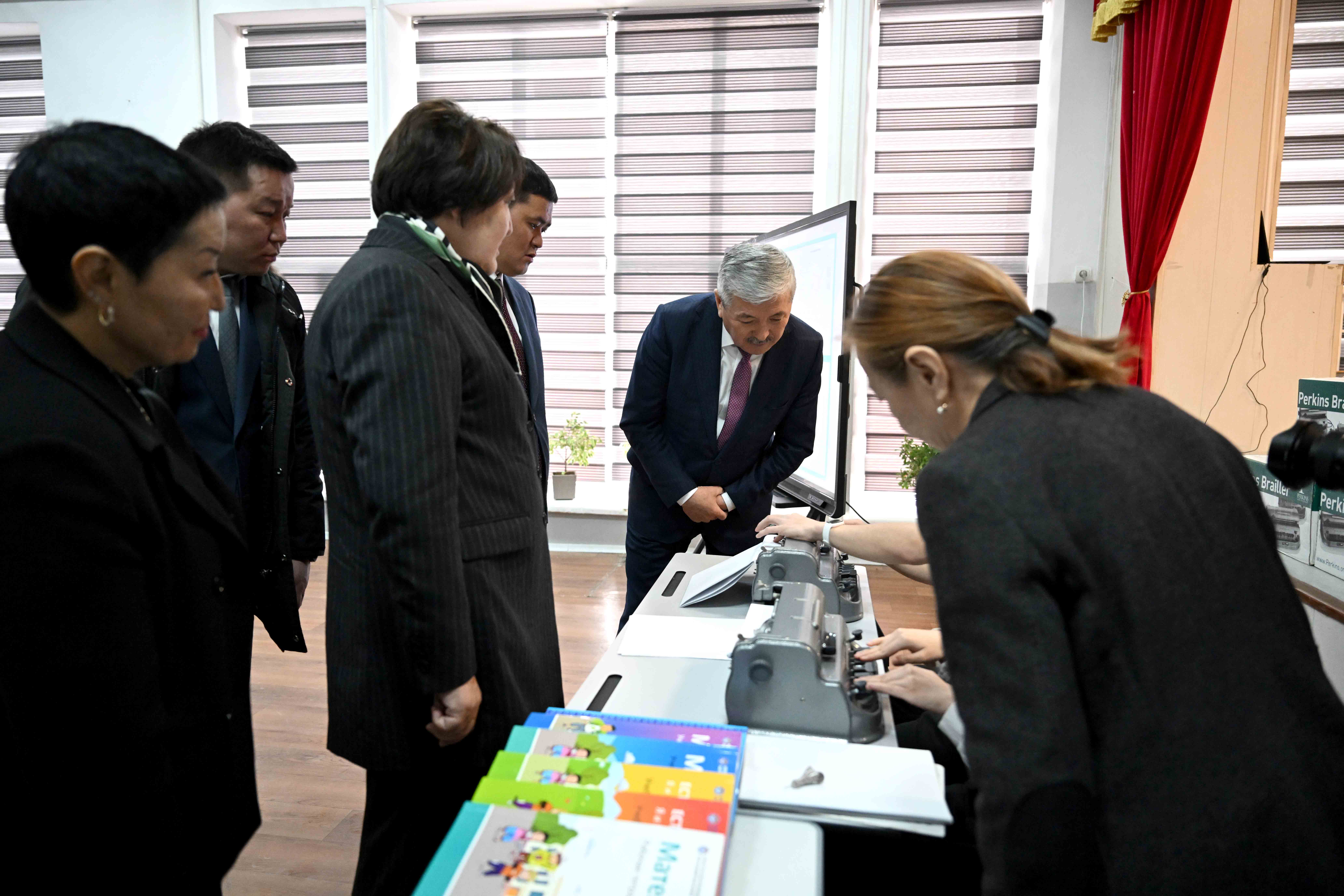 Кыргыз Республикасынын Министрлер Кабинетинин Төрагасы – Кыргыз Республикасынын Президентинин Администрациясынын Жетекчиси Адылбек Касымалиев Бишкек шаарында жайгашкан Көрүүсү начар жана азиз балдар үчүн атайын жалпы билим берүүчү мектеп-интернатына Брайл системасы боюнча жазган Perkins Brailler Classic үлгүсүндөгү 10 машинка тапшырды.