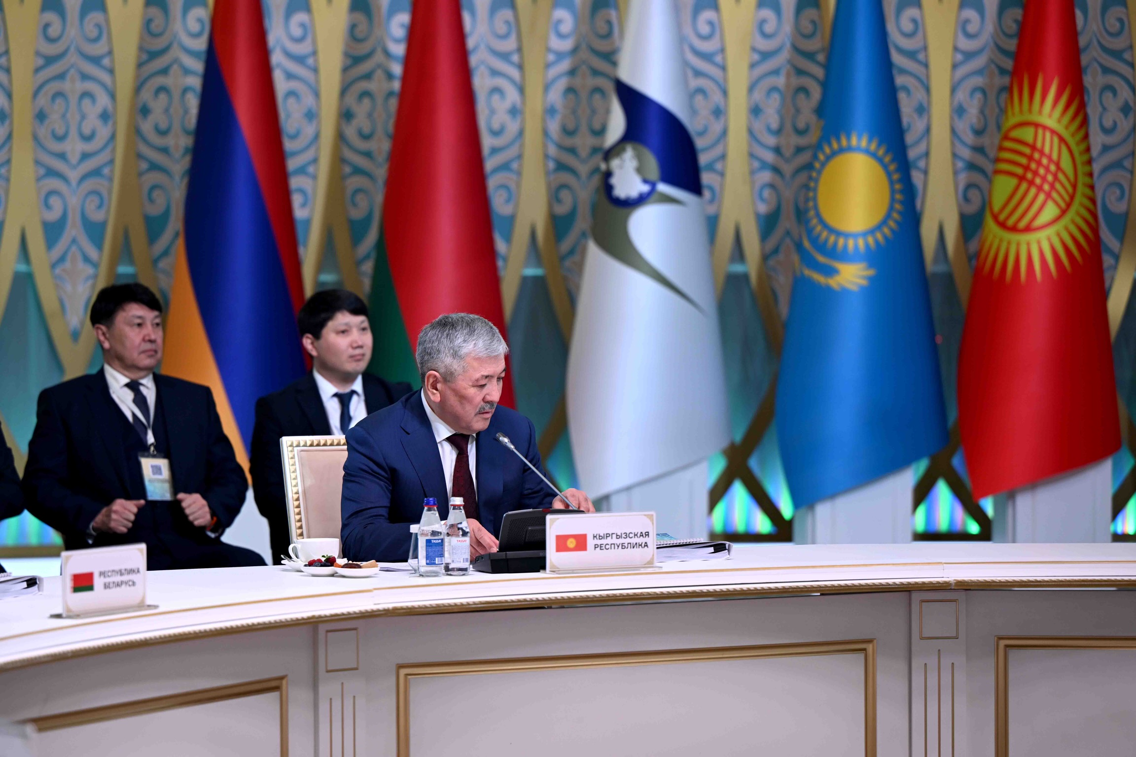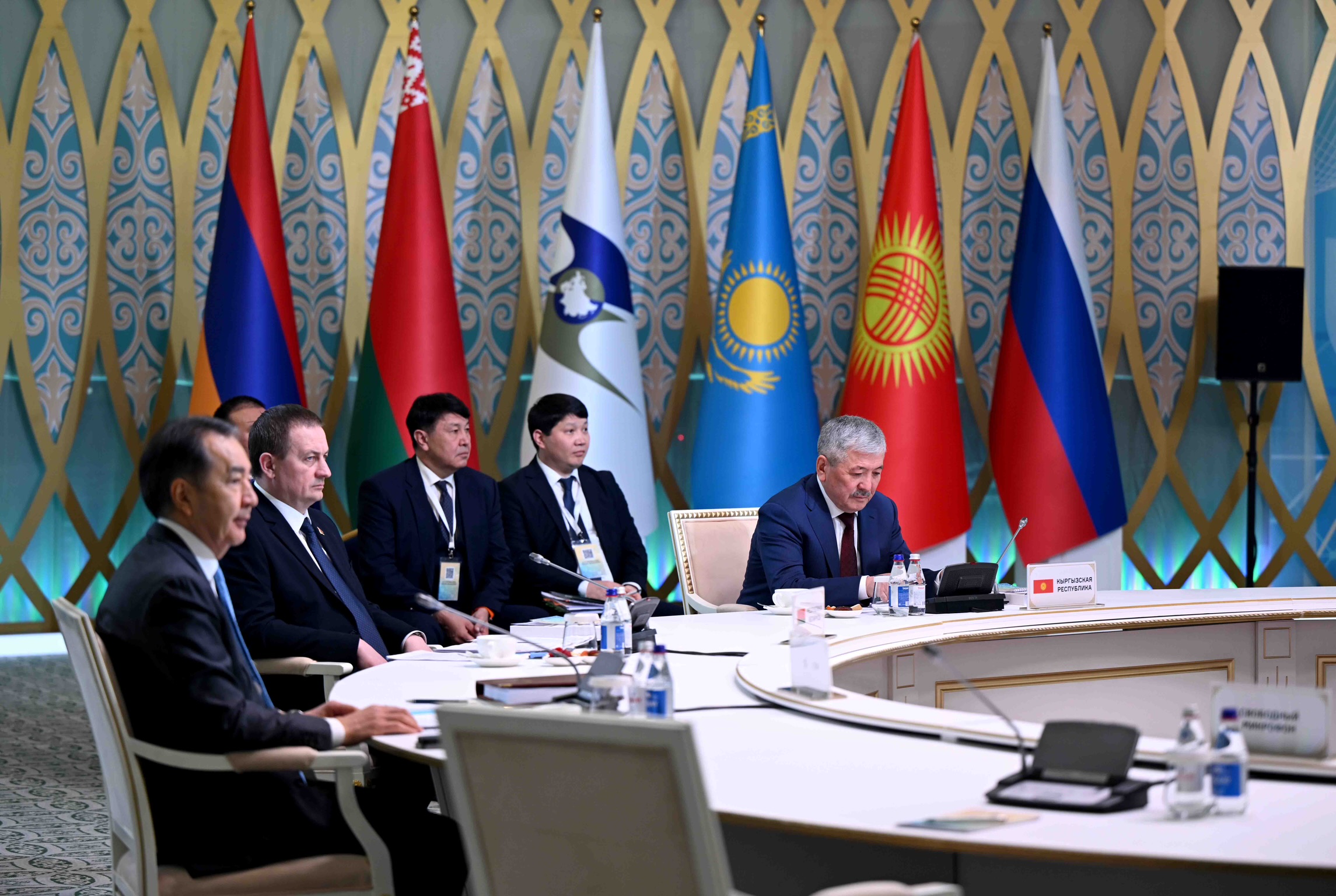 Евразия экономикалык биримдигине (ЕАЭБ) мүчө мамлекеттердин Өкмөт башчыларынын деңгээлиндеги отуруму башталаар алдында, саламдашуу жана биргеликте сүрөткө түшүү аземи аяктагандан кийин делегация башчылары жыйынга катышуу үчүн залга өтүштү.