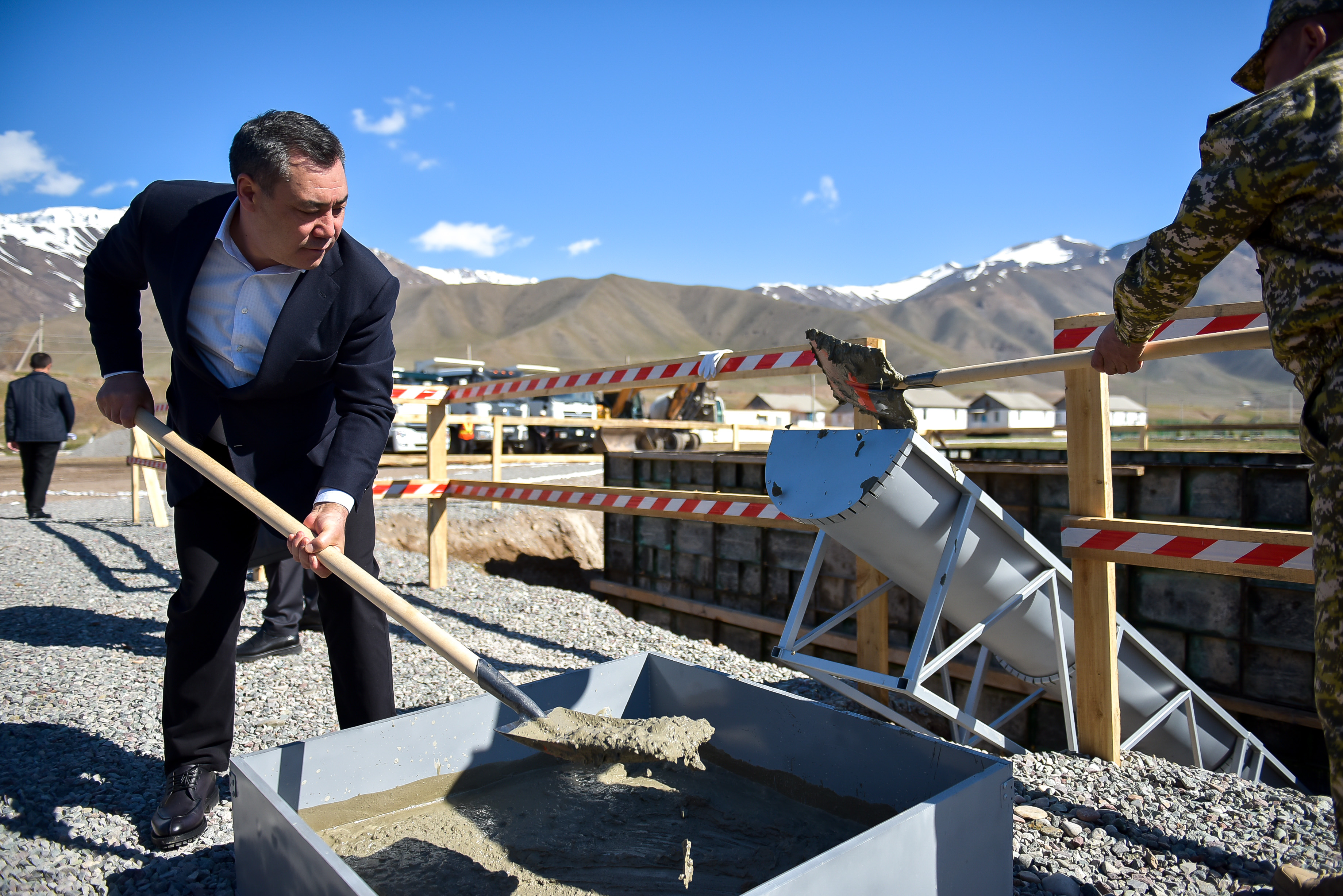 Чек ара бекетин кыдыруунун жүрүшүндө Президент Садыр Жапаров жаңы объекттердин курулушуна баштап берип, имараттардын биринин пайдубалына алгачкы курулуш аралашмасын куйду.