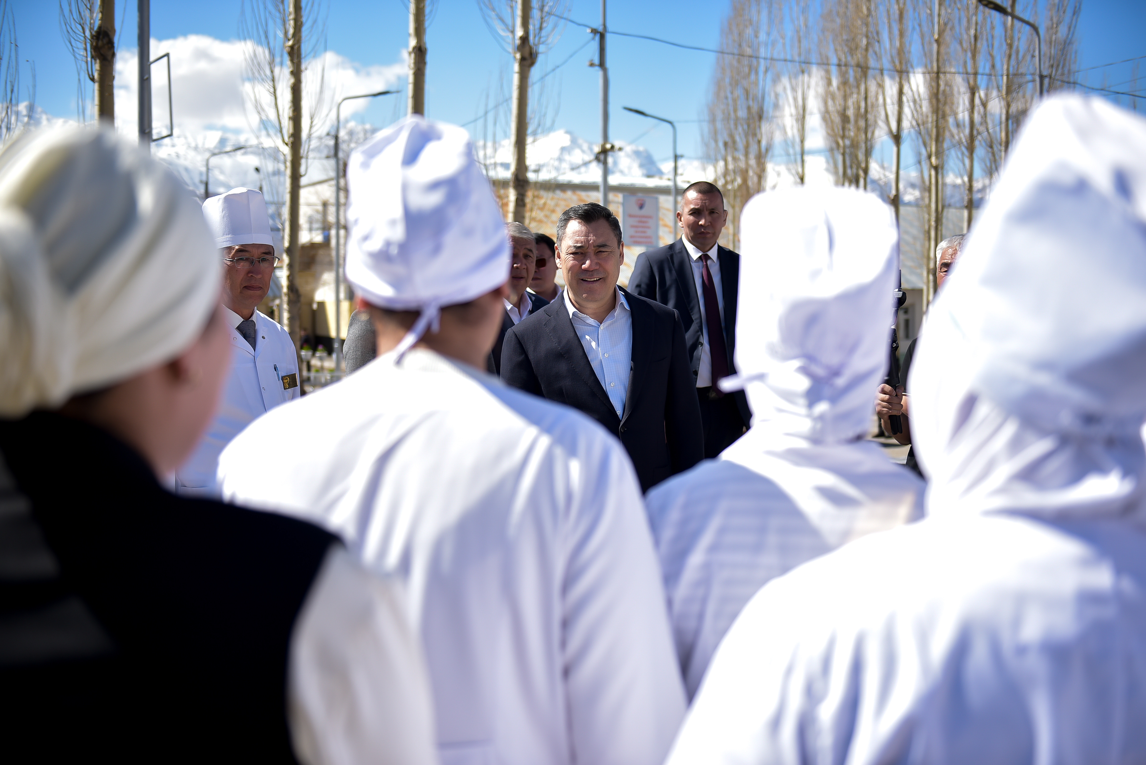 Андан соң Президент Садыр Жапаров медицина кызматкерлери менен баарлашып, аларды социалдык колдоо тууралуу маселелер да көтөрүлдү. Эмгек акыны этап-этабы менен жогорулатуу пландалып жатканы белгиленди.