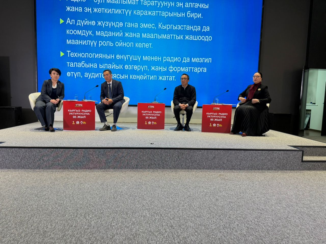 УТРКнын директору Уланбек Сатиев өз сөзүндө радионун дээрлик бир кылымга созулган өнүгүү жолуна жана бүгүнкү күндөгү ордуна токтолду. Анын белгилешинче, радио бирикмеси 1967-жылы негизделген жана өткөн жылы президент Садыр Жапаровдун демилгеси менен имаратта оңдоо иштери жүргүзүлгөн. Корпорациянын курамындагы радиолор заманбап шартта иш алып барып жатканын айткан башкы директор, "Биринчи радио" "Ала-Тоо 24" телеканалы менен биргеликте таңкы берүүгө чыгып жатканын белгиледи. Алдыда Кыргыз радиосу менен Маданият каналы дагы бирге иш алып барып, чогуу контент жасай турганын айтты.