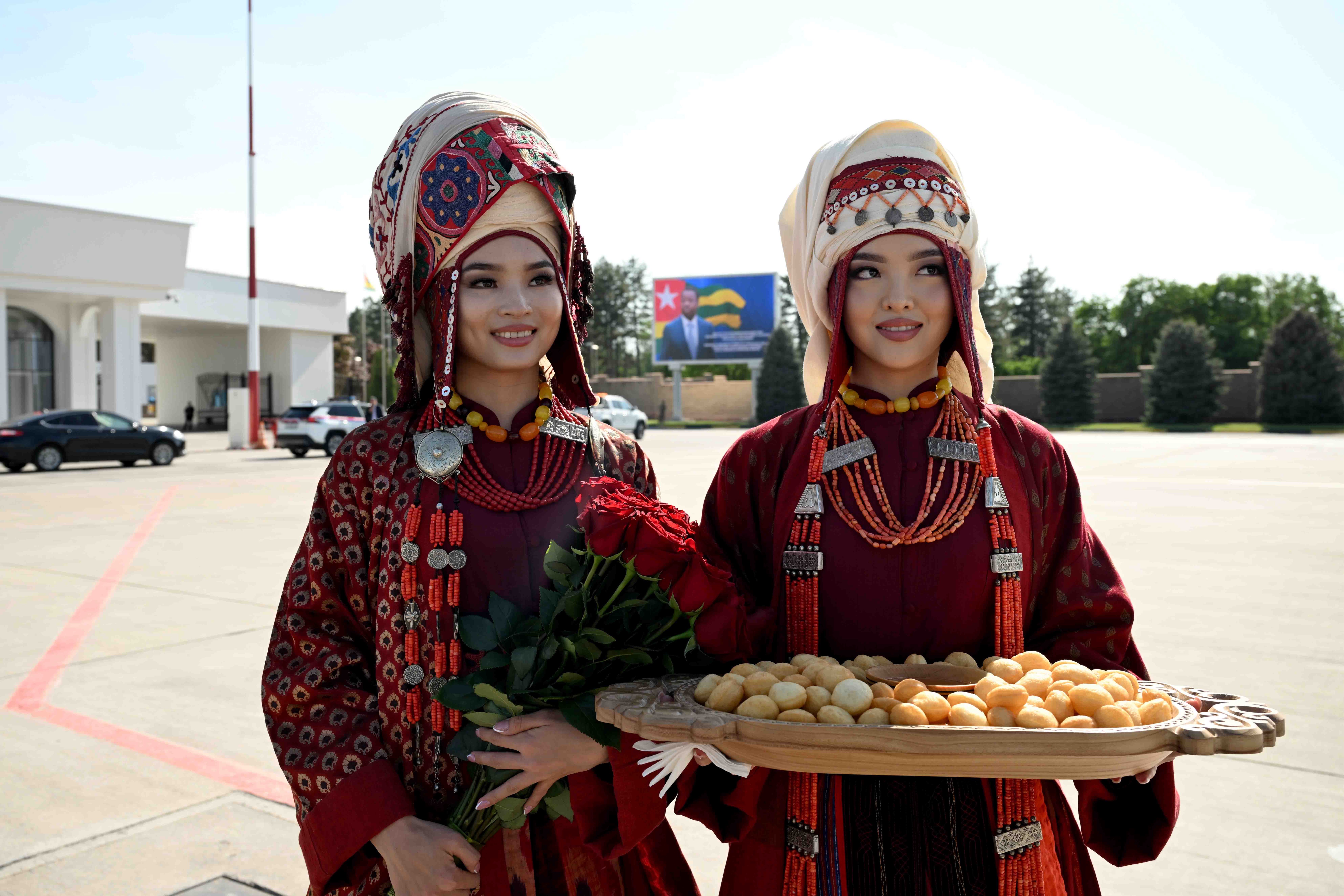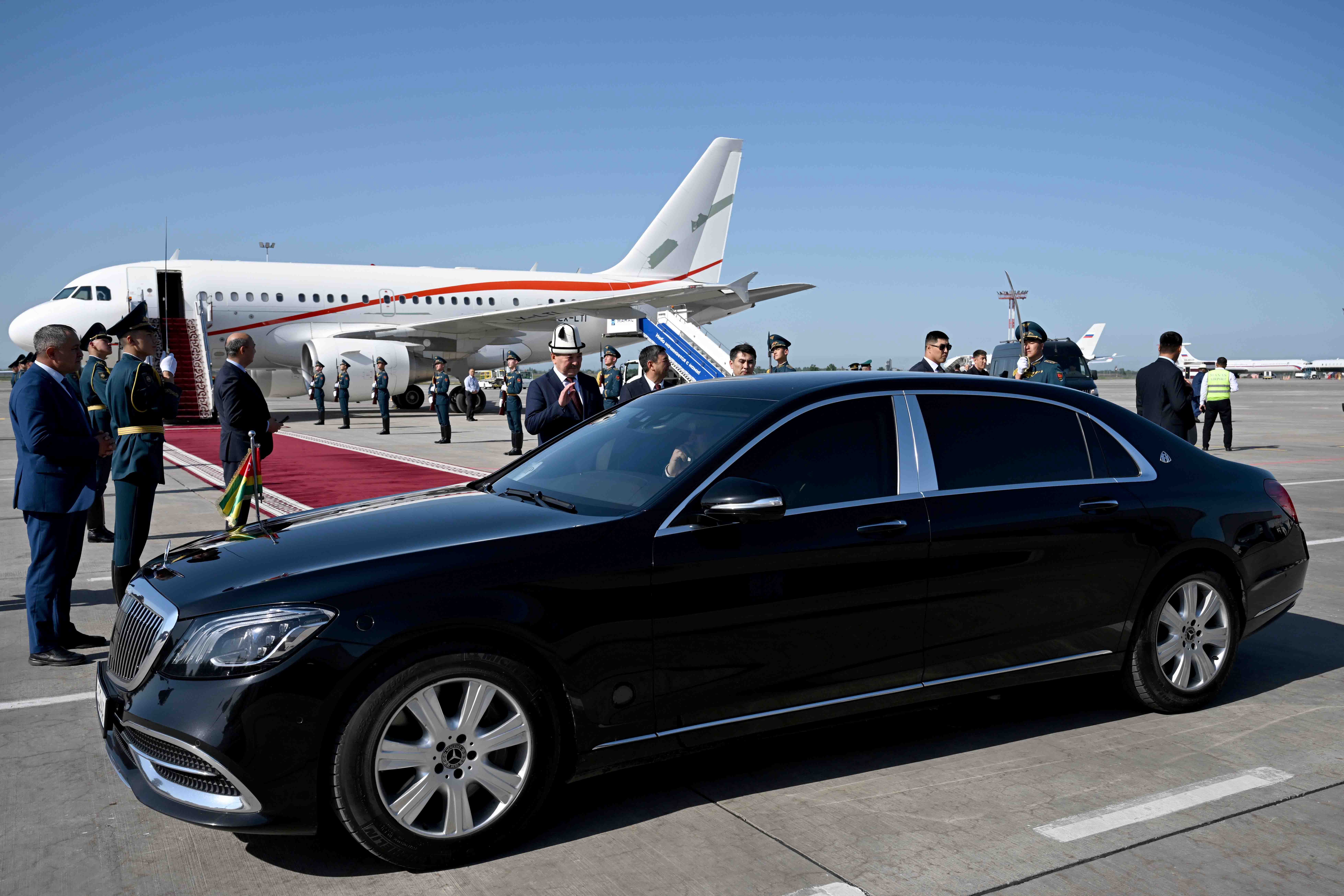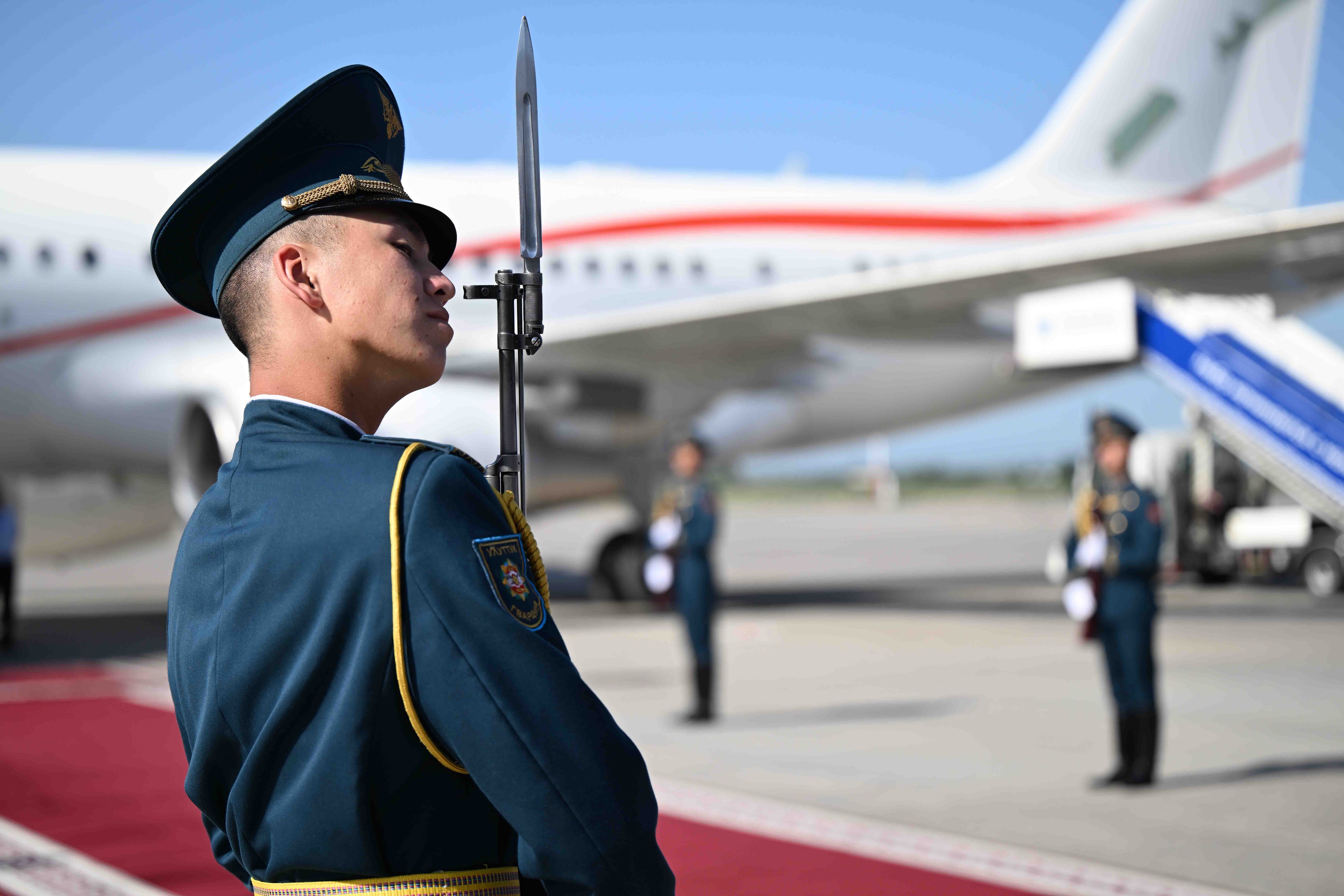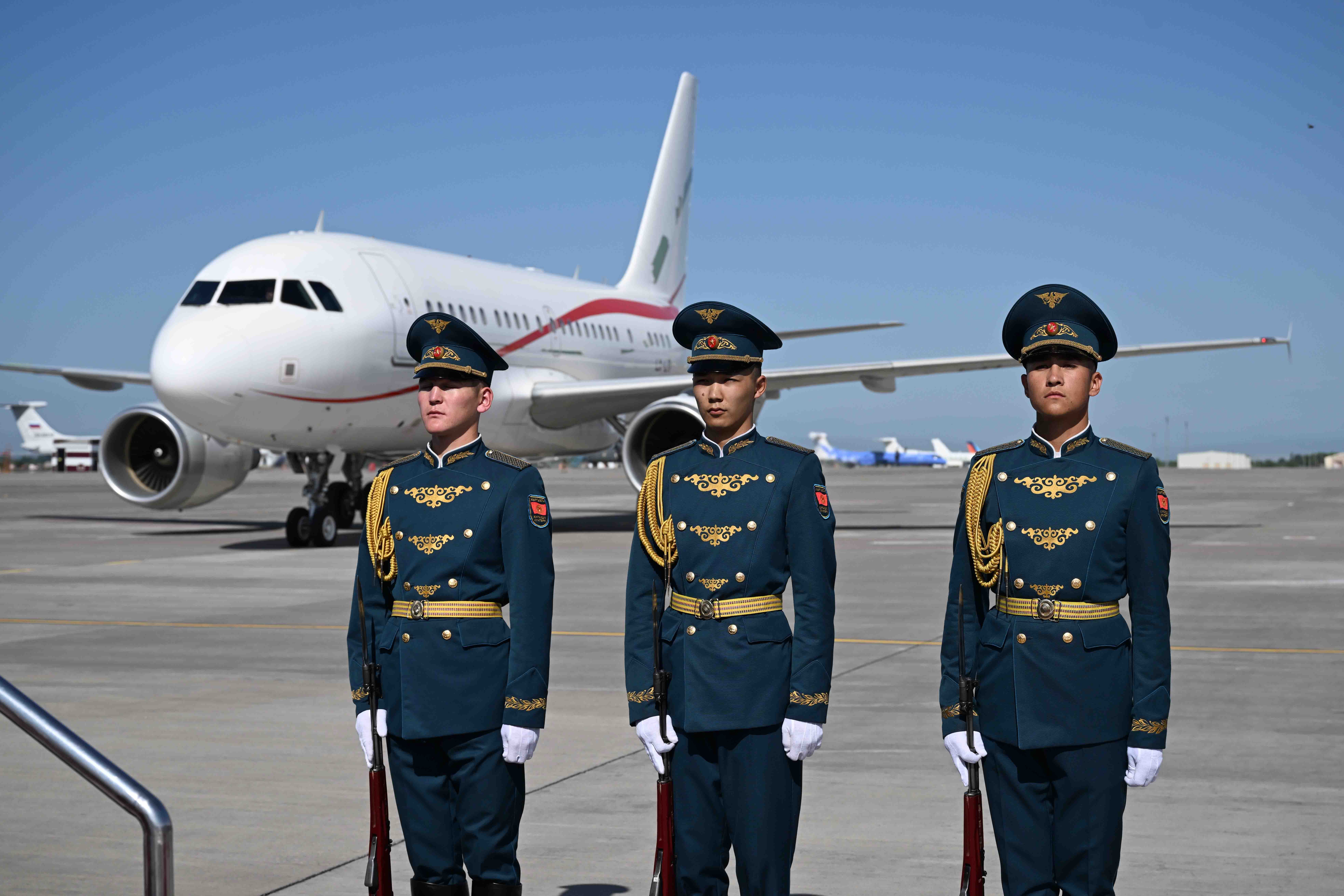Аэропортто эки өлкөнүн мамлекеттик желектери илинип, ардактуу кароол тизилди.